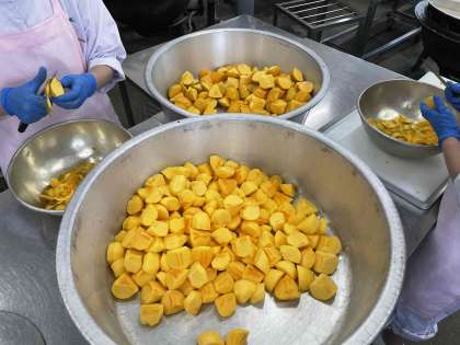 「柿」は和歌山県産のものが学校に届き、調理員さんが一切れずつ皮をむいてくれました。