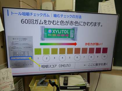 「ガムをかむ実験」を通して、自分のかむ力をタブレットを使って実験します。「思っていた以上にかむ力が強い人や弱い人。」