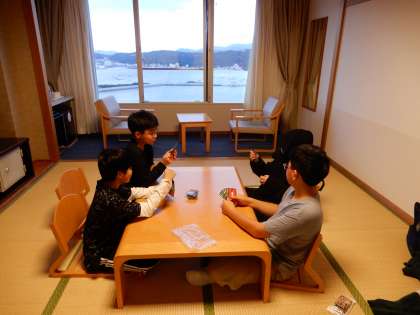 (写真中)部屋に入ると広さ十分で、しかも福良港が一望できます。子どもたちは、さっそく部屋の友達とカードゲームで遊びます。