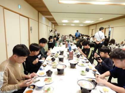 (写真中)今日の朝食も、様々な料理が用意されました。みんな美味しそうに朝食を食べていました。