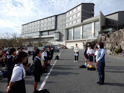 (写真下)いよいよ「閉舎式」です。子どもたちは、いろいろなもてなしを行ってくださった「休暇村 南あわじホテル」の皆さんに感謝を伝えます。