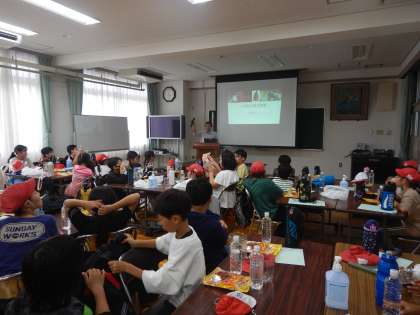 (写真上)多目的教室で「防災教室」です。尾西食品さんに来ていただき、防災の大切さを教えていただきました。1時間以上の話でしたが、子どもたちは最後までしっかり話を聞いて、防災の大切さを学びました。