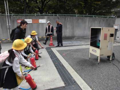 その後、水消火器を使った消火訓練、消防車に搭載している機材の説明、救助する際の作業などを見学しました。