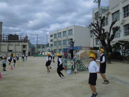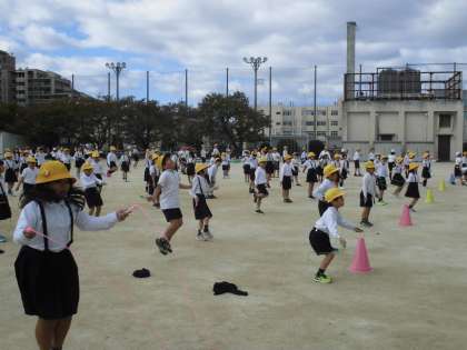 全校児童が運動場に集まり、様々な技を練習します。