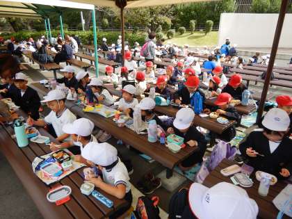 (写真下)おなかペコペコ。お弁当タイムです。小学校に入って、初めて自分たちだけで食べるお弁当です。みんなの笑顔がはじけます。