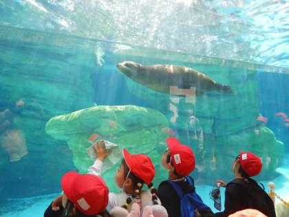 (写真上)かっこいいアシカを、水面の下から見ることができます。アシカが通るたびに子どもたちの歓声が起こります。