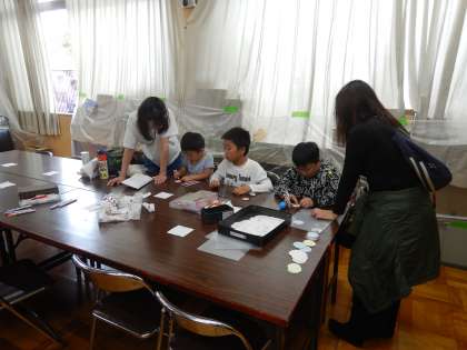 (写真下)「缶バッジ作り」の実習体験コーナーです。子どもたちは、いろいろな絵を描きながら、「世界に一つの缶バッジ」を作りました。