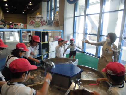 (写真上)キッズプラザ名物の「シャボン玉コーナー。」子どもたちは、夢中になって大きなシャボン玉を作ります。