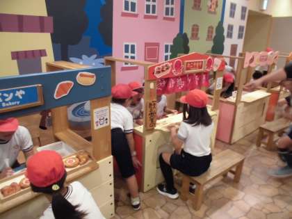 (写真下)キッズストリートにある、いろんなお店で、「お店屋さんごっこ」を楽しみます。寿司屋・パン屋・たこ焼き屋・ケーキ屋など、子どもたちはお店の人になったり、お客さんになったり、あちこちから楽しい会話が聞こえてきました。