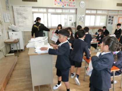 (写真中)冬休みの様々な課題を集めます。習字や作文や漢字練習や計算プリントなど、各学年でいろいろいな課題を集めていました。