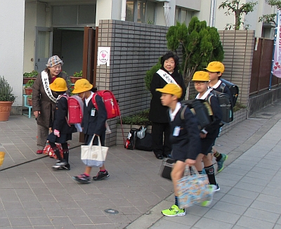 毎月1回、都島区更生保護女性会の方が正門の所で、見守りとあいさつの呼びかけの「早朝あいさつ運動」をしていただいています。子どもたちがいつでも元気のよいあいさつができるようにと願います。