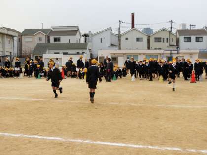 (写真上)朝の児童集会では、「異学年縦割り班」による「リレー大会」が行われました。子どもたちは、歓声を上げながら、違う学年の友達の走りを応援しました。違学年のふれあいは、淀川小学校が大切にしているものです。