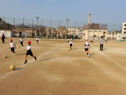 (写真中)1年生は寒い中ですが、一人一人が運動場で力いっぱいサッカーを楽しみました。1年生ですが、とてもサッカーが上手な子たちもおり、びっくりです。広い運動場だけに、思いっきりサッカーが楽しめます。
