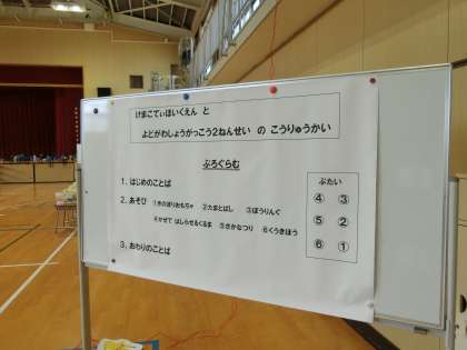 写真は、はじめの会の様子です。2年生の代表児童が挨拶をし一緒に遊びコーナーをまわるペア作りを行いました。