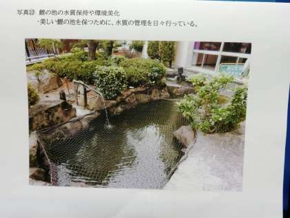 四季折々の美しい花々を育てて、玄関前には一年中花々がきれいに飾られています。玄関横の「鯉の池」は、いつも美しい水に保たれ、かわいい鯉が泳いでいます。さらに、一年中子どもたちのために、朝の見守り活動をしてくれています。