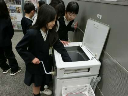 (写真上)昔の「洗濯機」に挑戦です。「へー、こんなふうに洗濯機を使っていたんだ!」実際に触って動かしてみると、昔のくらしがよくわかります。