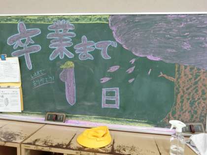 6年生の黒板には、「卒業まであと1日」と黒板に書かれていました。