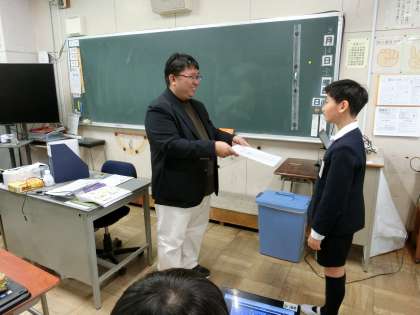 教室に戻った子どもたちは、「教室で最後の授業」を受けます。それは、通知表を担任の先生からもらうことです。一人ひとりに、通知表が手渡されました。