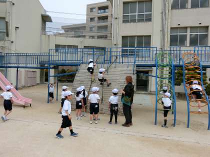 総合遊具やジャングルジム、丸太橋や鉄棒など、1年生の子どもたちは、様々な遊具を楽しみました。
