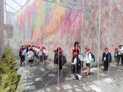 前日からの雨も上がり、涼しい気候の中、1年生から6年生までの子どもたちは一路「夢洲」に向かいました。