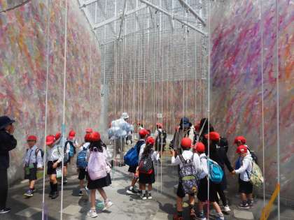 (写真下)不思議なひもを触ると、きれいな音が響きます。3年生が1年生と手をつないで、しっかりリードしてくれる姿が、頼もしく思えました。