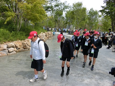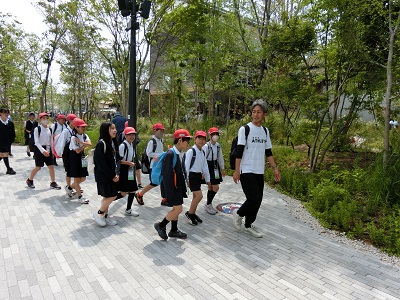 (写真上)静けさの森を歩く6年生。みんな、万博の緑の中を楽しそうに歩いていました。