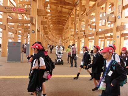 (写真下)「大屋根リング」の下を歩く6年生。6年生がしっかりしているので、心強く思えます。