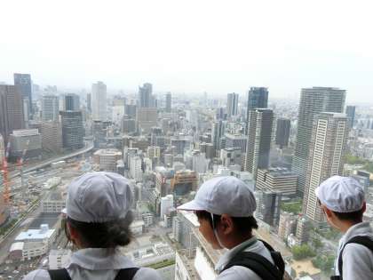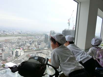 3年生が、梅田スカイビルに行きました。地上40階のビルで、最上階からは大阪市が一望できます。