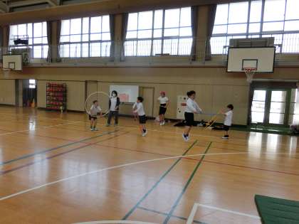 「平均台の一本橋」を渡ったり、「跳び箱の壁」を越えたり、「フラフープ縄跳び」をしたりと、子どもたちは夢中になってアスレチックゲームに取り組んでいました。