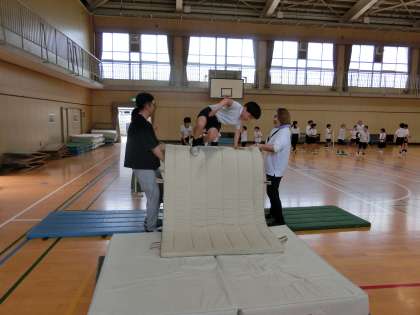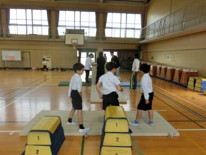 この5月は体育館で、サーキットアスレチックゲームです。跳び箱や平均台やマットやフラフープなどを使って、様々なコーナーを作って、みんなで楽しみます。