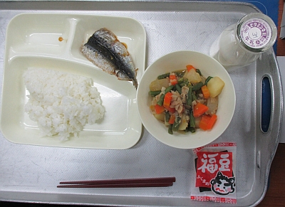 今日の給食は、「節分の行事献立」です。メニューは、いわしのしょうがじょうゆかけ、含め煮、いり大豆とご飯・牛乳です。