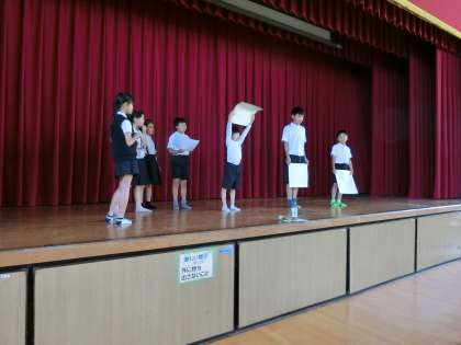 【写真上】集会委員会が、金曜日の「児童集会」で行うゲーム進行のリハーサルをしています。みんなが楽しめる、どんな集会になるでしょうか?楽しみです。