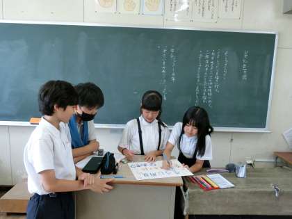 【写真下】美化委員会が、校内を美しくする呼びかけのための「ポスター」を作っています。丁寧なポスターが出来上がっていました。