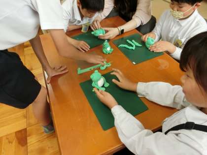 紙粘土に、緑色の絵の具を混ぜて、カエルの形を作っていきます。可愛いカエルを作るというテーマなので、みんなが夢中になって「世界に一つのカエル」を作ります。