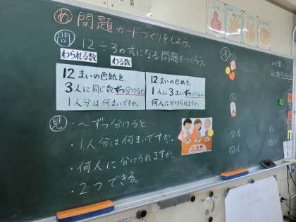 子どもたちは、12÷3が使える式を一生懸命に考えます。そして、問題を作って互いに紹介し合っていきます。
