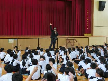 訓練の終わりに体育館に集まった子どもたちに、不審者役をしていただいた警察の方がお話をしてくれました。