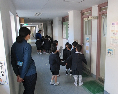 2年生が1年生といっしょに「学校たんけん」をしました。班ごとに2年生が1年生を学校の主な教室や部屋に連れて行き、その部屋の名前や何をする所なのかを説明していました。
