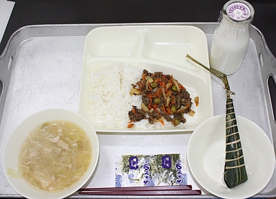 この日の給食は、「こどもの日の行事献立」でメニューは、牛肉のちらしずし、すまし汁、ちまき、牛乳でした。