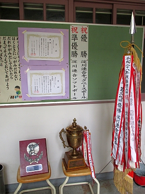 5月22日の日曜日、都島区スポーツ大会が友渕小学校グラウンドで開催されました。淀川連合子ども会は、こどもソフトボールの部で準優勝、こどもキックベースボールの部で優勝しました。児童朝会時に、メンバーにあらためて表彰状や優勝旗、優勝カップ、準優勝楯を授与しました。