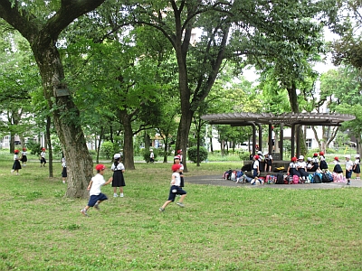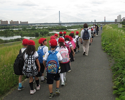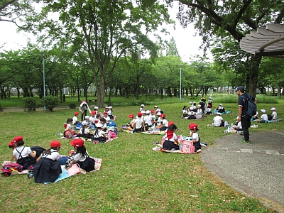 1年生が雨で延期になっていた春の遠足に行きました。城北公園まで河川敷を歩いて行きました。公園内の広場で遊んだ後、お弁当を食べました。小学校で初めての遠足でしたが、長い距離をがんばって歩きました。