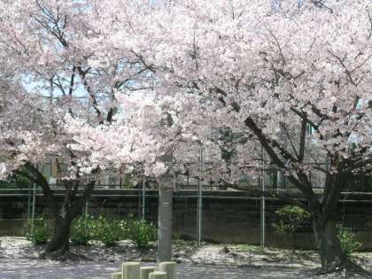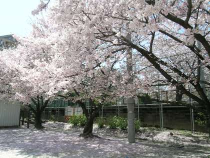 今年も、校庭に桜の花が咲きました。子どもたちの入学を祝うように、桜の花が満開です。青空に映えてとてもきれいです。