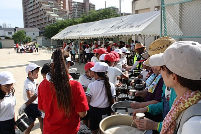 夕食のカレー作りをしました。かまどを作り、火おこしをする班と野菜を切る班に分かれて準備をしました。