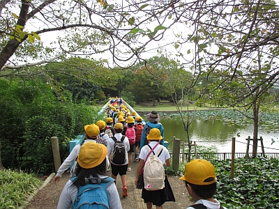 3年生が秋の遠足で長居公園に行きました。園内の自然史博物館では、館内の展示物を見学したり、クジラの骨格標本を見ながら説明を聞いたりしました。お弁当は公園内の芝生広場で食べました。たくさん見学し、たくさん歩いた一日でした。