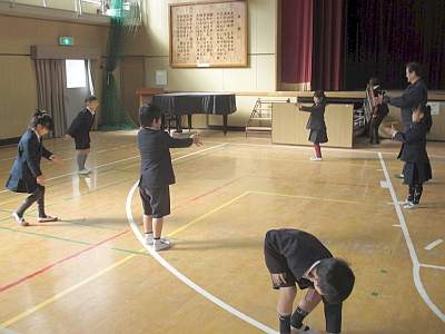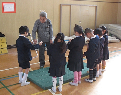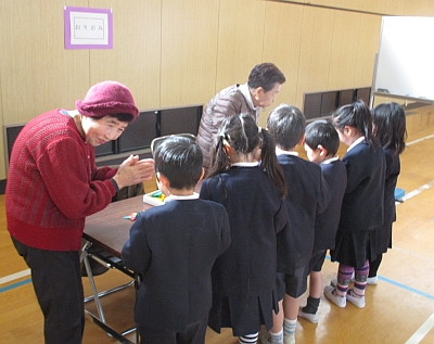地域の老人会の方々を招いて、1年生に昔遊びを教えていただきました。竹とんぼ、紙飛行機、だるま落とし、メンコ、ヨーヨー、コマ回し、お手玉・あやとり、折り紙などの遊びのコーナーに分かれて、順番に遊んでいきました。