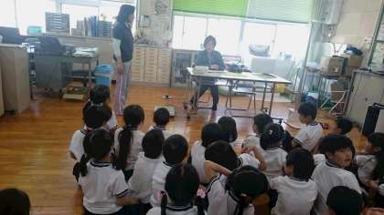 2組は体育の授業です。整列の練習や準備運動の練習をしました。1組は発育測定です、保健室の先生のお話をしっかり聞いて行動できます!