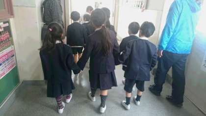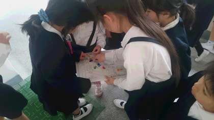 2年生がしっかり説明してくれました。説明した部屋の校舎図にシールをはります。