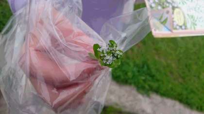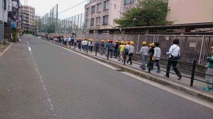 クローバーの葉を校長先生のバッグにプレゼントしました。最後まで並んで安全に帰ります。