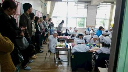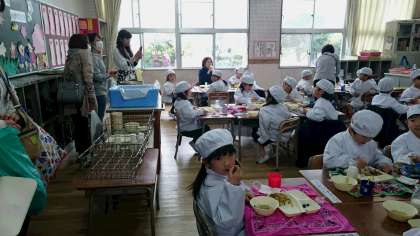26日の参観・懇談会には多くの保護者にきていただきました。雨の中、ありがとうございました。1年生は給食参観。自分たちで運び・配膳できるようになりました!