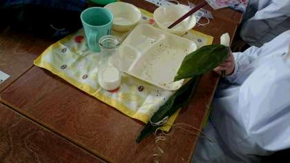 5月「和食のマナーについて知ろう」お箸のもちかた、お椀の持ち方・・・いろいろ勉強しましょう。今日は「ちまき」が出ています。1年生も一生懸命食べています!完食!