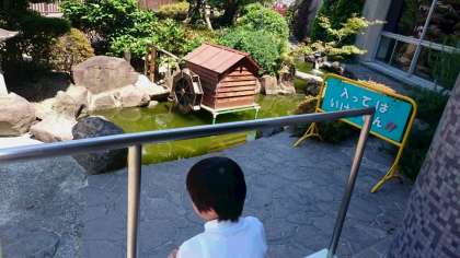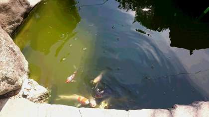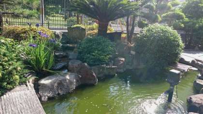 正門横の池には鯉がいます。子どもも大人も安らぎの場所になっています。